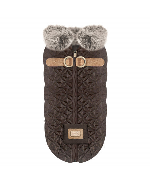 Chic et pratique 🍂 : cette doudoune matelassée marron fait aussi office de harnais pour allier confort, chaleur et sécurité lors des balades. Un indispensable pour l’hiver des petits et moyens chiens ❄️🐶.